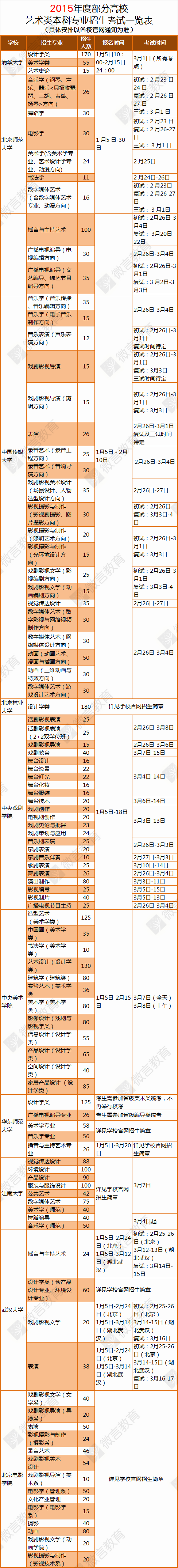 进入新年,多所名校发布艺术类招生简章。小编今天特意为大家整理了清华大学、北京师范大学、中国传媒大学、中央戏剧学院、北京电影学院等10所名校的2015年艺术类本科专业招生计划,小编预祝各位考生艺考顺利,早日圆梦!(提示:具体招生计划及时间安排以各高校官网通知为准)