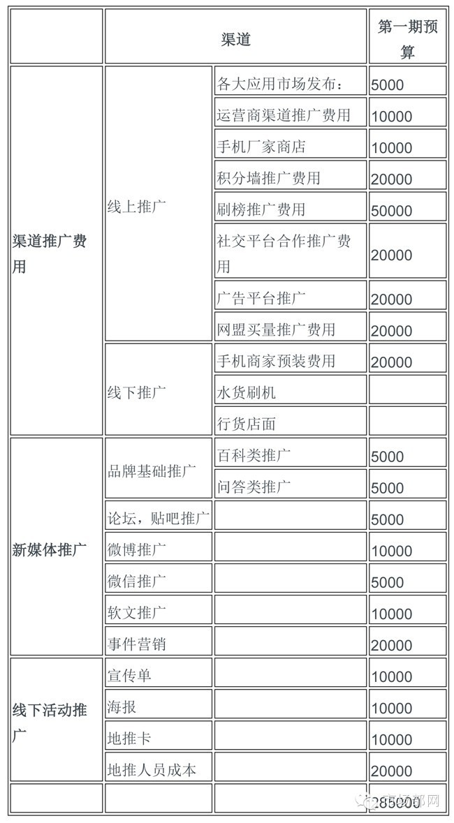 根据以上推广方案对各渠道做预算配比,与老板敲定最后的第一期投放预算。如图: