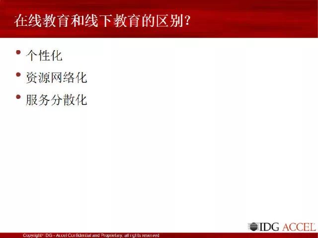 第三,服务的分散化。原来我们讲传统的教育方式经常出现的模式是大方向课,可能在大型的城市,或者中心的城市资源相对比较集中,在分散的城市没有太多的服务的供给。未来在线教育,因为网络没有边界,所以,不管地理位置也好、交通也好,各种原因,或者时间受到限制,用户都可以通过在线教育的平台享受到服务。这是在线教育和线下教育很大的差别。