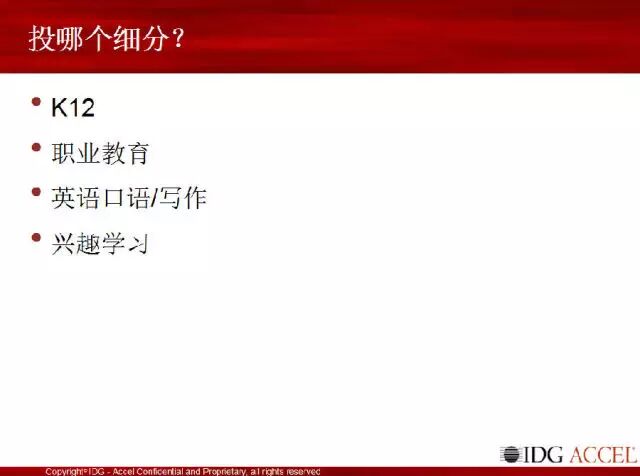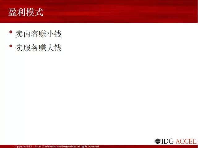 最后一个方面,我们依然认为优质的内容会有价值。我之所以放到最后一点,认为内容积累在中国的市场环境里面时间比较长,同时也会面临很多版权的问题。如果创业团队有足够的耐心,优质的内容还是会发光发热,至少今天在视频网站的竞争中,大家发现优质的内容还是很有价值。就是所谓大家原来积累下来草根上传的视频,实际上最后在流量变现的时候,没有太多的商业价值,最后还是同步效应。我想在教学领域里面,有特别优质的内容,如果能够被沉淀和积累下来,从长期来看也是一座金矿,当然这个过程可能比较痛苦,但是没有办法,还是有价值。