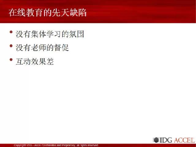第一个我们讲在线教育没有集体学习的氛围。目前在线教育的方式里面,给用户创造出互相激励,或者有样板效益的学习氛围,做的是比较粗浅和不够的。但这是线下教育非常强的一点,大家可以形成人群的聚集效应,让大家产生你追我赶的竞争属性。