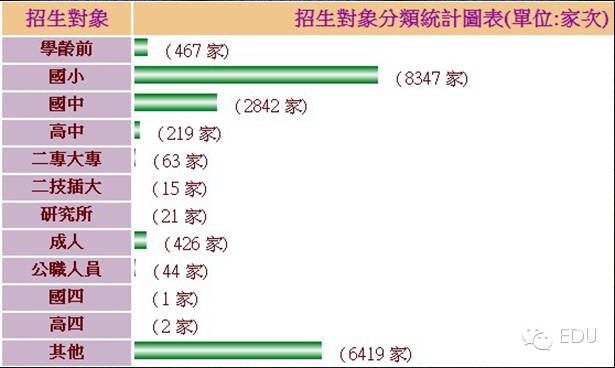 十年前台湾的培训学校已经饱和了,所以看速度非常慢,十年才成长一倍,但是大陆发展非常快。1.8W家培训学校有1.1W家做文理类,就是大陆的文化课,做考试,占比很高,因为最赚钱。小学阶段,外语补习班2300万人一共有两千多家。台湾的培训学校广告已经做了20多年,做的和一般企业已经差不多了,但是它只是没有上市因为市场太小。