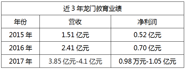 1月15日,龙门教育发布未经审计的业绩预增公告。2017年,公司预计实现营业收入3.85亿元至4.1亿元,同比增长60%-70%;净利润9800万元-1.05亿元,同比增长40%-50%。经历了并购后的“龙门教育”,后续将如何发展?