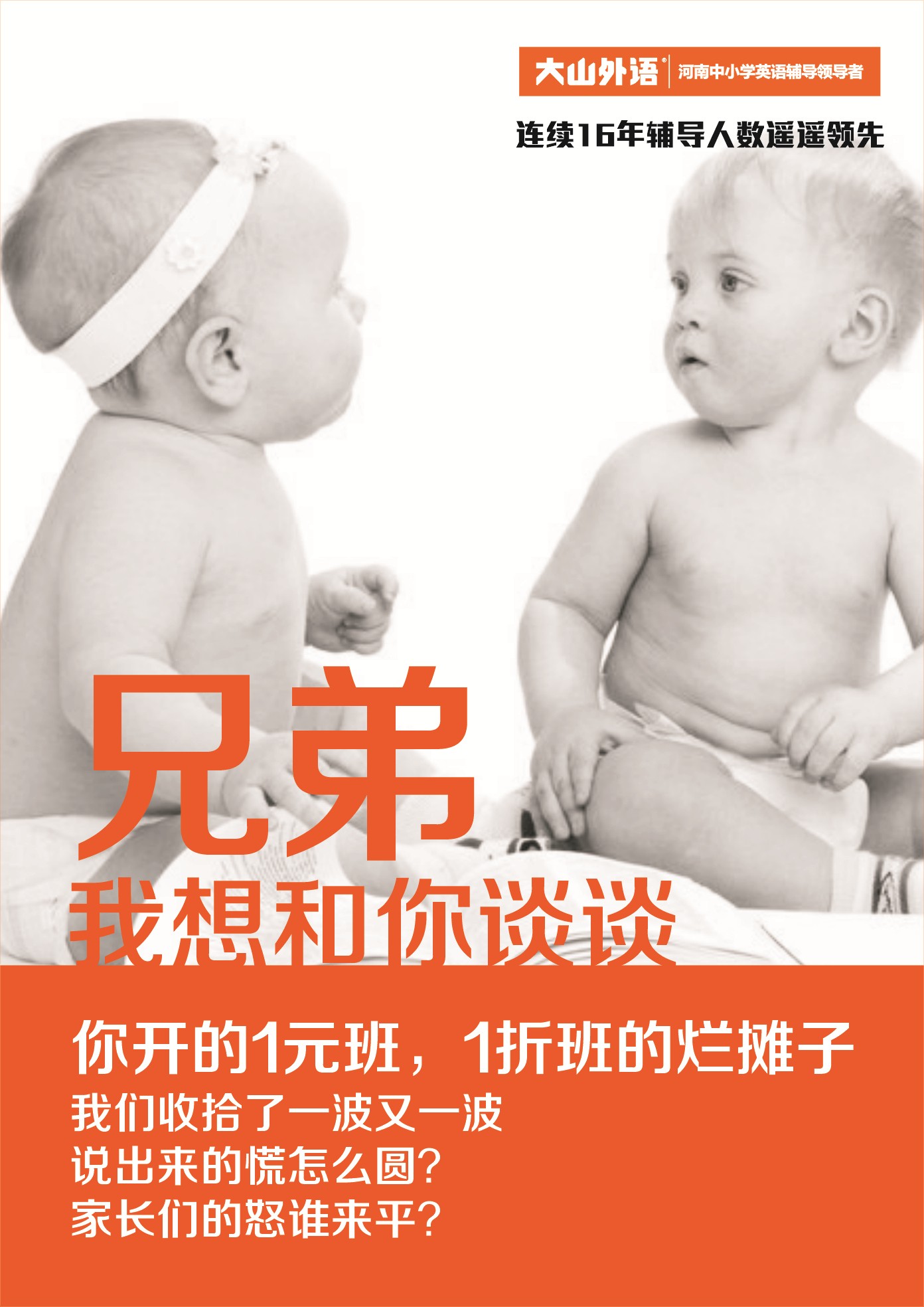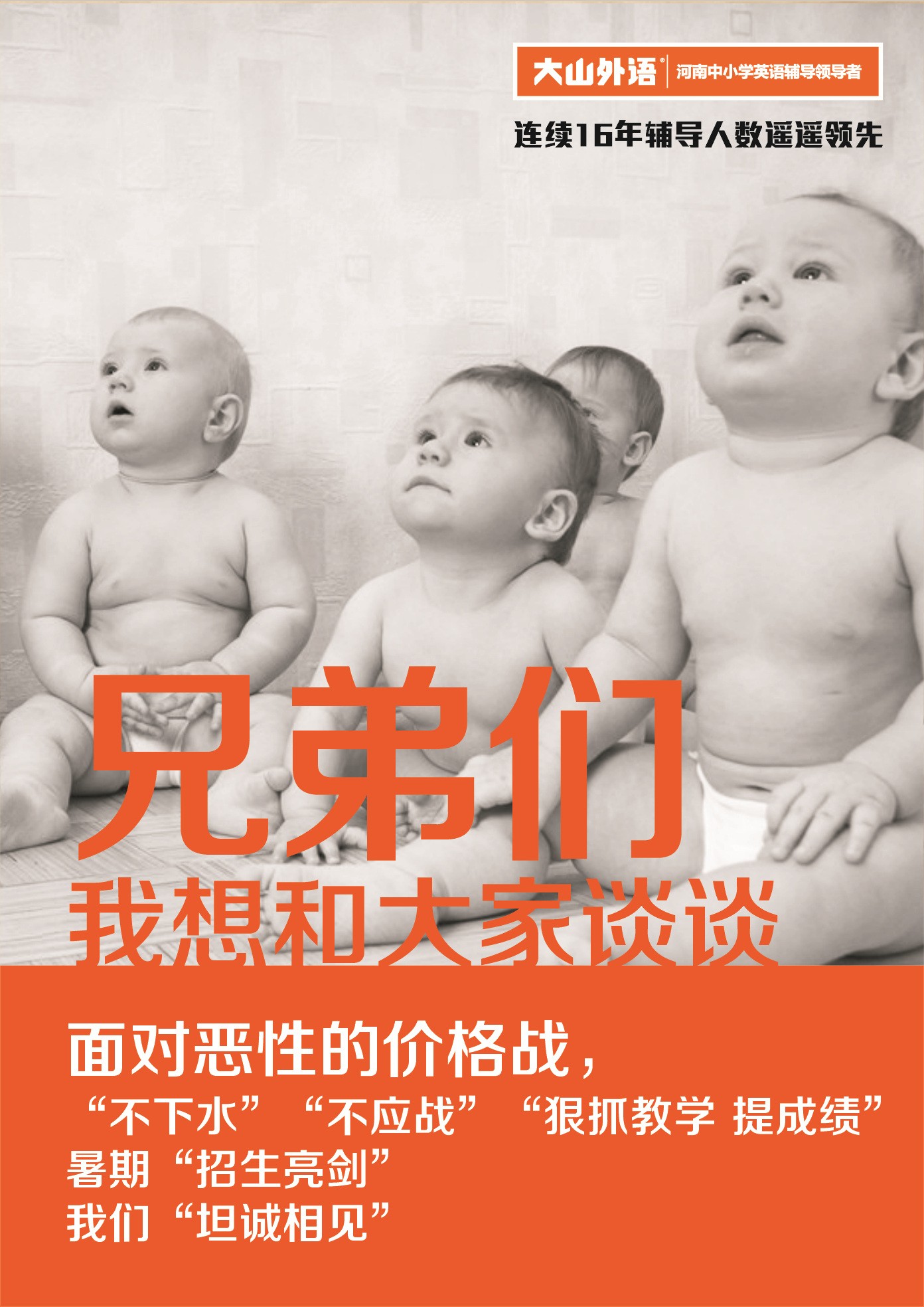 为保护市场良性竞争环境,大山外语号召同行兄弟齐心协力共同抵制“低价战”,维护行业底线,用成绩说话,做让家长放心的教育!