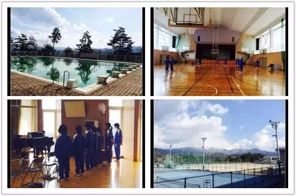 (图为长野县泰阜村中学的游泳池、网球场、篮球场和音乐室,学校还有各种功能教室若干。隔壁的小学竟然还有一家小美术馆。)
