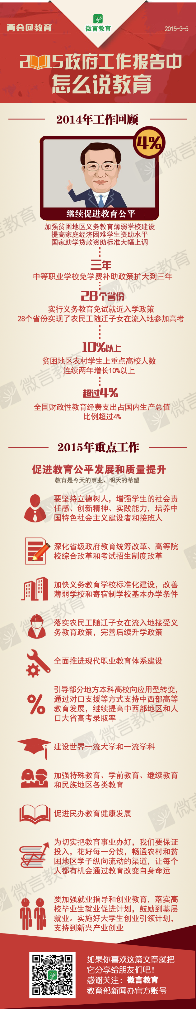 3月5日,第十二届全国人民代表大会第三次会议在北京人民大会堂开幕。国务院总理李克强作政府工作报告。李克强在报告2014年工作回顾和2015年重点工作时均提到了教育相关工作,他在政府工作报告中对教育说了什么?下面一图带你了解。