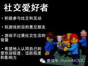 我的学生们大部分是社交爱好者,他们强烈希望与其他同学建立有意义的联系。在游戏世界中,社交爱好者通常是一座桥梁,他们似乎认识所有的玩家,有助于形成小团体。社交爱好者形成的小团体是志同道合的玩家群体,当某个游戏变得索然无味,社交爱好者只会换一个游戏玩,而保持小团体的完好。游戏不过是一个为聊天和互动设计的简单背景,聊天和互动才是真正吸引他们的东西。社交者用朋友数量或者关注人数来衡量自己的成就。我们又有多少人知道,对于学生来说,课堂只是他们的友谊和社交生活的背景?