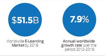 全球e-learning市场规模于2011年达到了356亿美元,接下来五年内的年均复合增长率约为7.6 %,2016年全球e-learning销售额将达到515亿美元。