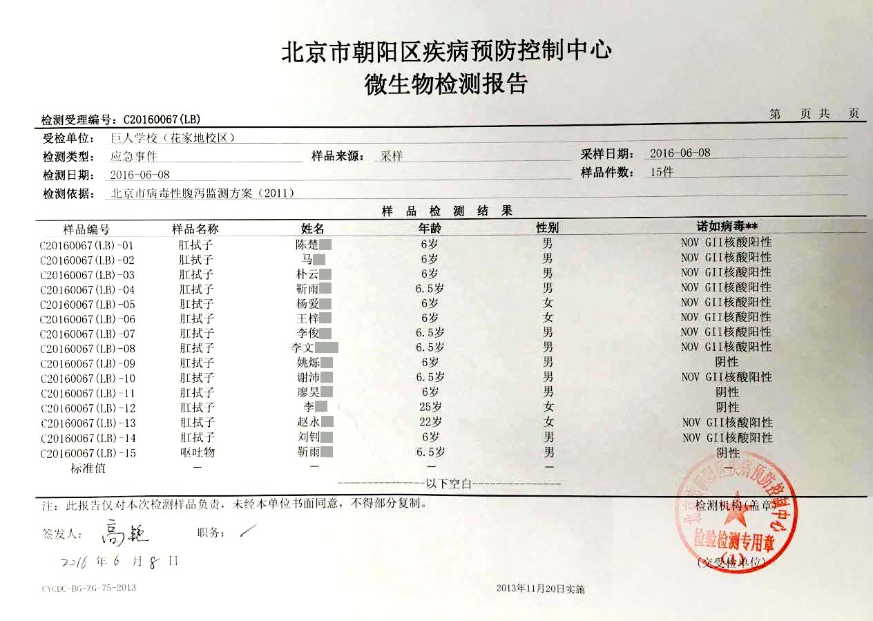 小巨人官方在回应中称,朝阳疾控中心对学生呕吐物进行了检测。检测报告显示,证实学生呕吐原因为诺如病毒感染。朝阳区疾控中心派发给家长的《至学生家长的一封信》对“诺如病毒”做了如下注释:诺如病毒是一种常见的肠道传染病毒,容易在人群密集的场所发生局部聚集病例。