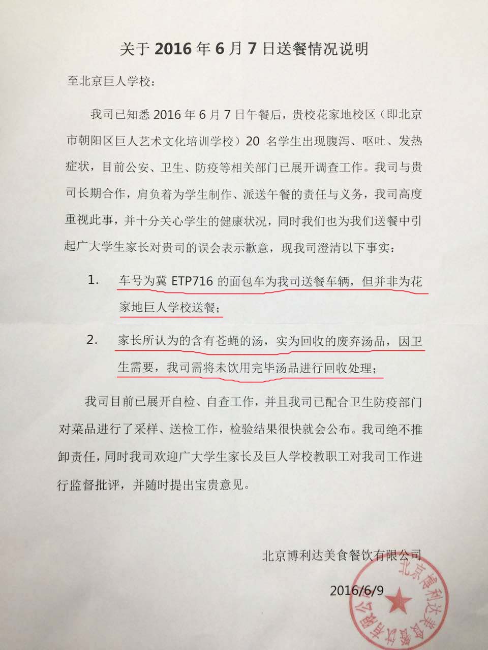 前情回顾:据北京电视台生活频道报道,2016年6月8日,花家地校区小巨人春季一班的20名学生先后出现腹痛呕吐现象。,家长们找到学校希望交涉处理,但该校区园长态度冷漠,在与家长沟通的过程中多次停止沟通,站起来就走。家长在校区等待的时候,正好遇到了给小巨人幼教的送餐车。家长表示,送餐人员“光着脚”、“还有一个人就坐在后面,和餐在一起“、”围裙已经黑得看不出原来的颜色“。随后,家长们在随车送来的汤里面发现了一只苍蝇。
