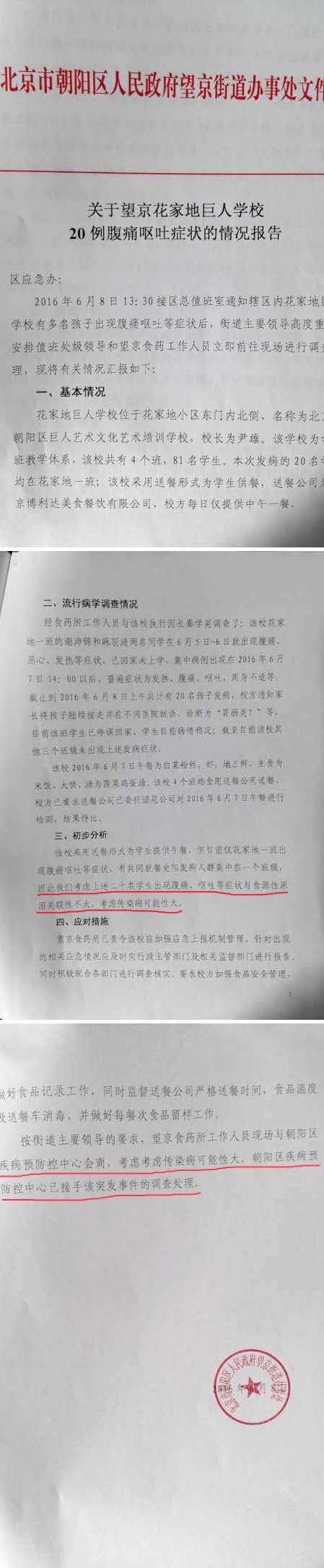 图为望京街道办事处发布的关于“黑心餐”事件的报告