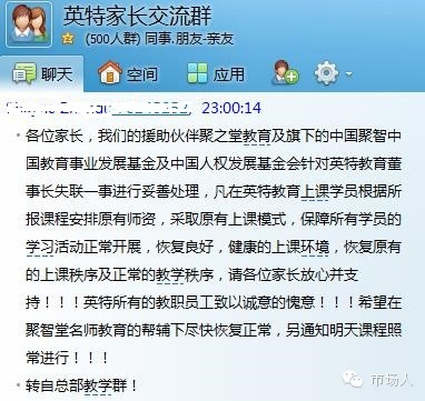 晚十时五十许,英特家长群传来消息称,经过现有高层自救协商,该校区将由聚智堂教育及其合作伙伴接手: