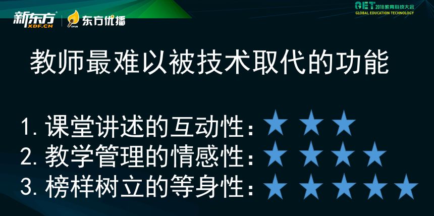 如果我希望在这种技术变革的年代还能很好地生存下来,得先想清楚这个行业中有哪些点是暂时不能够被技术替代的。第一个问题就是技术能否取代教师。