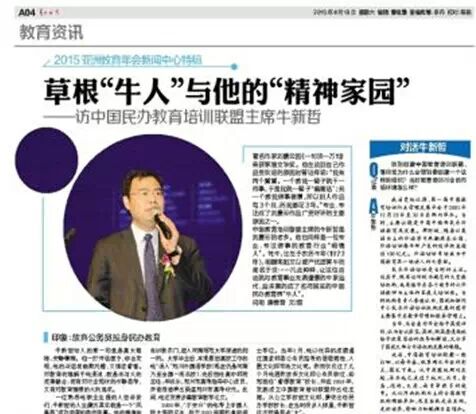 现在的牛新哲是一个大忙人。身为中国教育培训联盟主席,为了全面了解中国教育培训的发展现状,他经常南下北上,足迹遍布全国各地甚至走出国门,去探访先进的教育理念和成功经验,开阔的眼界和深刻的思考,让他对教育行业有了更加全面、深刻的认识。