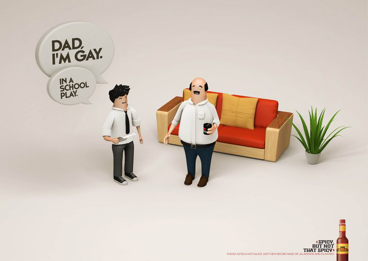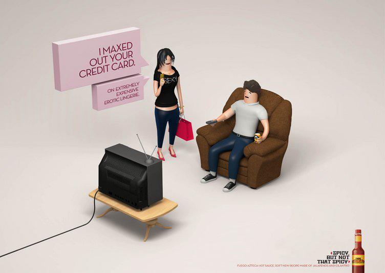 ▲Fuego Azteca辣椒酱广告:这则广告是文案比画面更加出彩的一则广告。广告用比喻来描绘味觉,文案第一句比喻辣酱给味蕾带来的强烈刺激,文案第二句则比喻辣酱带来的酣畅淋漓的美食享受。很辣,但是很爽,广告演绎地很到位。第一则:我刷爆了你的信用卡——买了件非常性感的内衣。