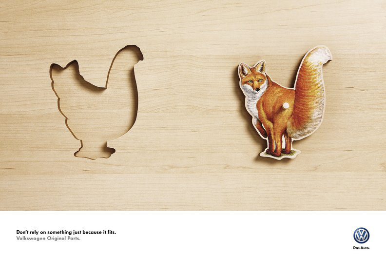 ▲大众原装配件广告:这是大众相当腹黑的一则广告创意。狐狸积木刚好可以填在鸡形的凹槽里,猫形积木刚好可以填满鱼形的凹槽,虽说也能安得上,但是猫遇到鱼、狐狸遇到鸡,肯定会毫无犹豫的吃掉啊。所以,不要因为有些配件刚好合得上就使用,潜在危险深不可测啊,还是用原装配件吧,安全第一。