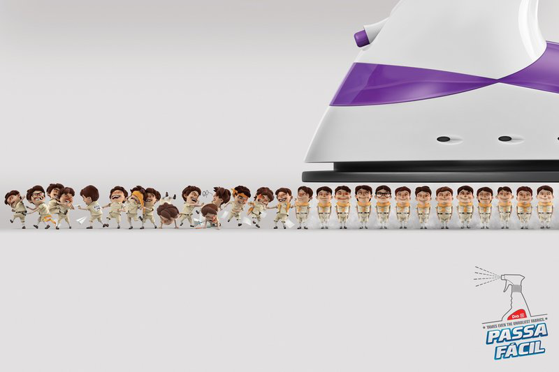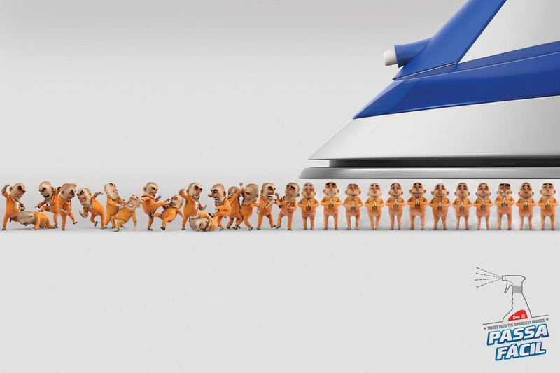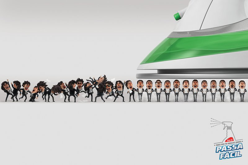 ▲Passa Facil喷雾广告:Passa Facil应该是一种有助于令衣物顽固褶皱被熨烫平整的喷雾。本广告采用了拟人化的趣味表现手法。从大打出手的囚犯到站如松的武僧,从疯狂的摇滚乐队到整齐划一的合唱团,从调皮捣蛋的学生到飒爽军姿的童子军,形象到位的表现让人忍俊不禁,更简单博得好感。