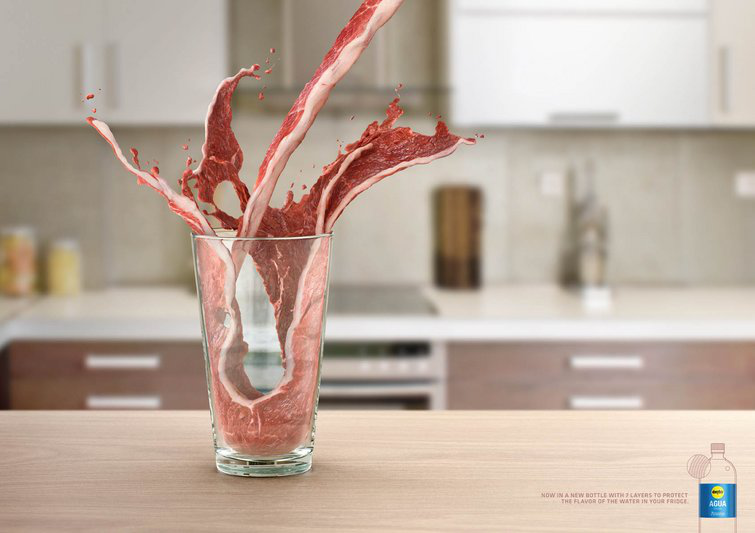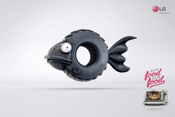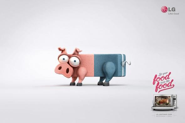 ▲LG微波炉广告:微波炉加热的食物容易变干变硬。LG的这组广告便抓住了这点来进行创作,如果你不想牛奶喝起来是拖鞋味儿,猪肉吃起来是橡皮味儿,鱼啃起来像在咬轮胎,那就赶紧使用LG微波炉。因为LG微波炉能让食物保持原味。