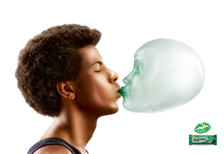▲Topline Gums口香糖广告:接吻时荷尔蒙急速上升会带来甜蜜感和快感。广告便以接吻来比喻Topline Gums口香糖的味道。广告创意的切入点很好,一目了然,但执行上却弱了点,吹出的泡泡头完全可以设计地更加黯然销魂点。