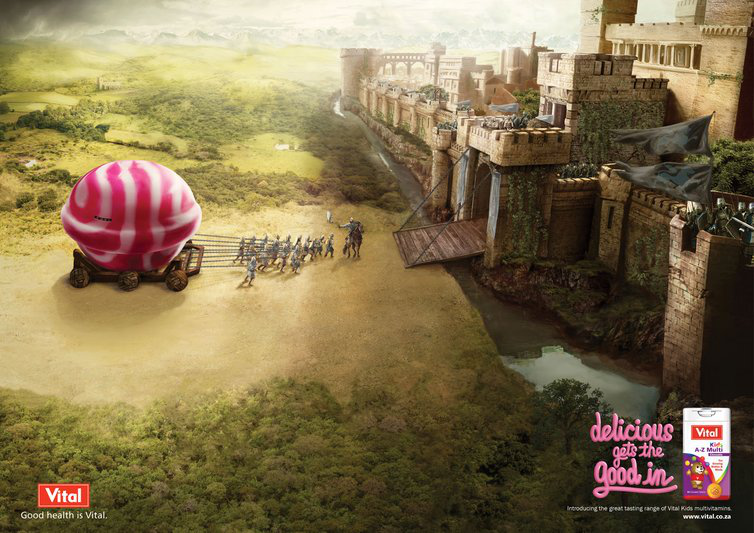 ▲Vital儿童维他命广告:这支广告化用了特洛伊木马的典故,以表示其中含有丰富美味的维他命。广告画面制作相当精美,但创意切入点却不见得精准。特洛伊木马进城后,里面暗藏的希腊士兵进行了攻城,最终致使特洛伊城的沦陷,由此特洛伊之战中木马里面的士兵寓意潜在的威胁。而广告里的维他命却不该是身体的潜在威胁。因此,以木马中的战士来寓意维他命,这样的暗指似乎并不合适。