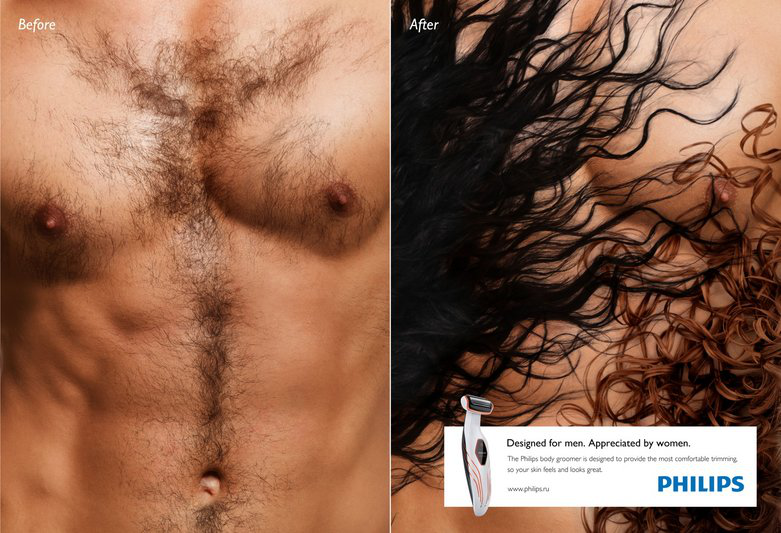▲飞利浦剃毛器广告:这是一支相当内涵的广告。这支广告由前后对比图组成,一边是毛发密布的胸毛,另一边则是如海藻般的美女长发,哪一边的男人更加具有魅力,答案不言而喻。