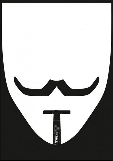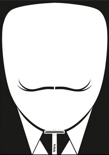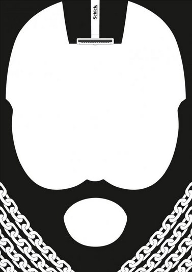 ▲Schick剃须刀广告:胡子之与男人的情结就像妆容之与女人,不弄则罢,化妆,续胡必须用心拾缀!留一部美须髯会为形象加分,并且一款服帖形象气质的胡子,能给人留下深刻印象!就像卓别林,达利,戴着盖伊·福克斯面具自由斗士V,还有硬汉形象的Mr.T...见胡如见人!所以,男士们,胡子的讲究不可小觑哦!留白恰到好处的一则广告。