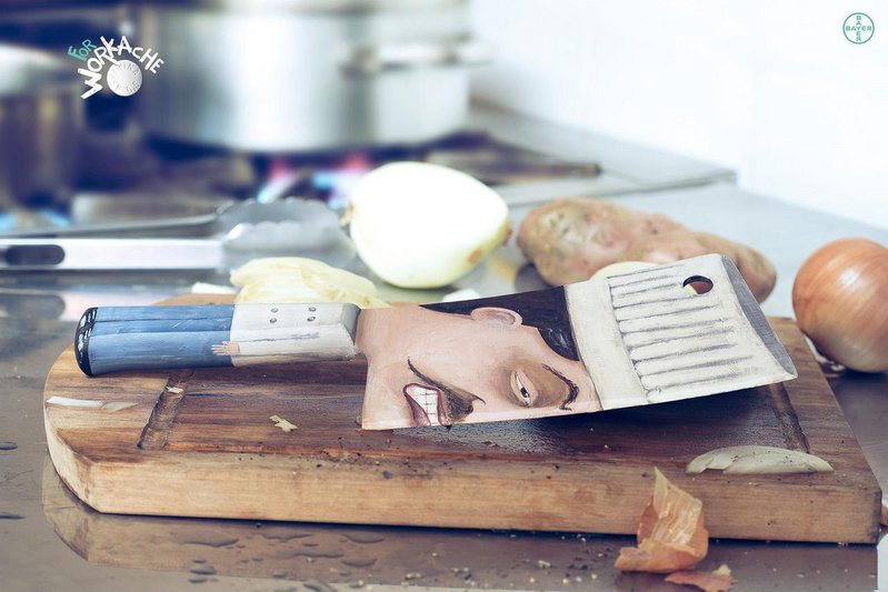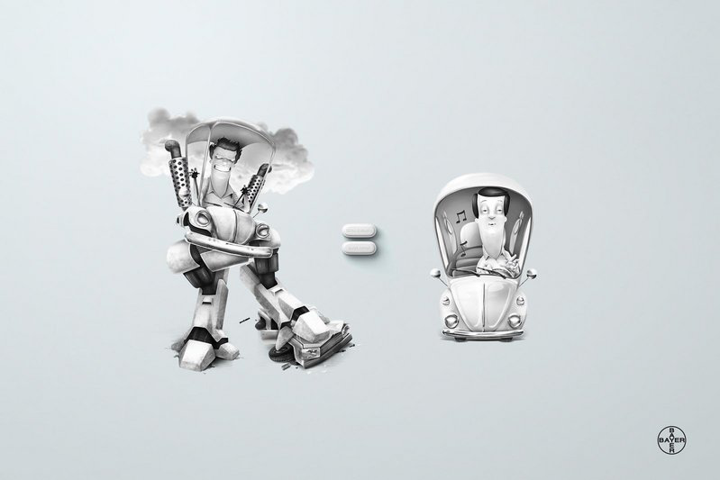 ▲阿司匹林止痛药广告:你有压力,我有压力,人人都背负压力。压力之下,身体也难免出现一些状况。不想忍受着揪心的头痛上班,那就试试阿司匹林,让它帮你缓解阵痛,助你工作一臂之力。极有画面张力的一组广告。