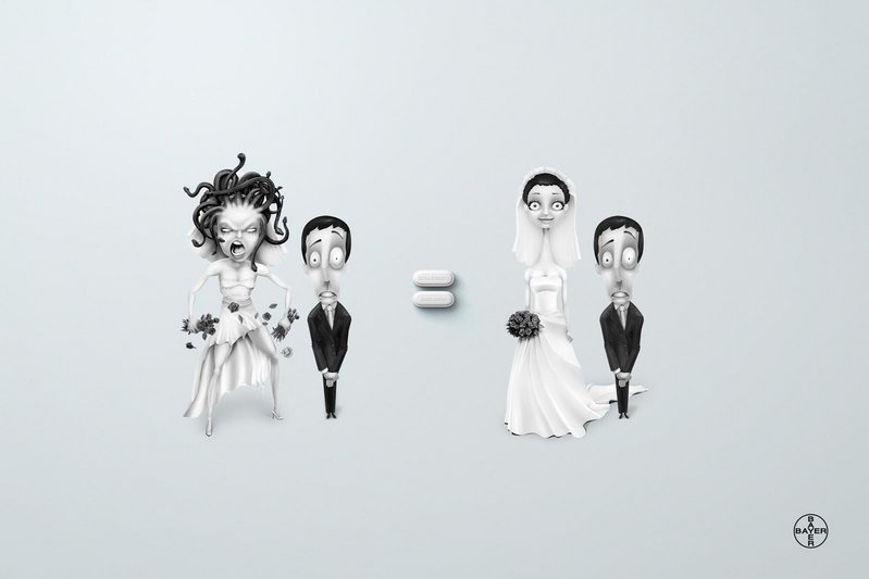 ▲阿司匹林止痛药广告:这是阿司匹林止痛药的另外一则广告。广告画面的设计风格有点暗黑系,尤其新娘的那张海报设计很类似僵尸新娘。生活难免有各种不如意,每个人也都是天使与魔鬼的综合体。健康时,我们是天使;头疼时,谁能不说我们有魔鬼倾向呢?不要紧,让阿司匹林帮你缓解头疼吧。