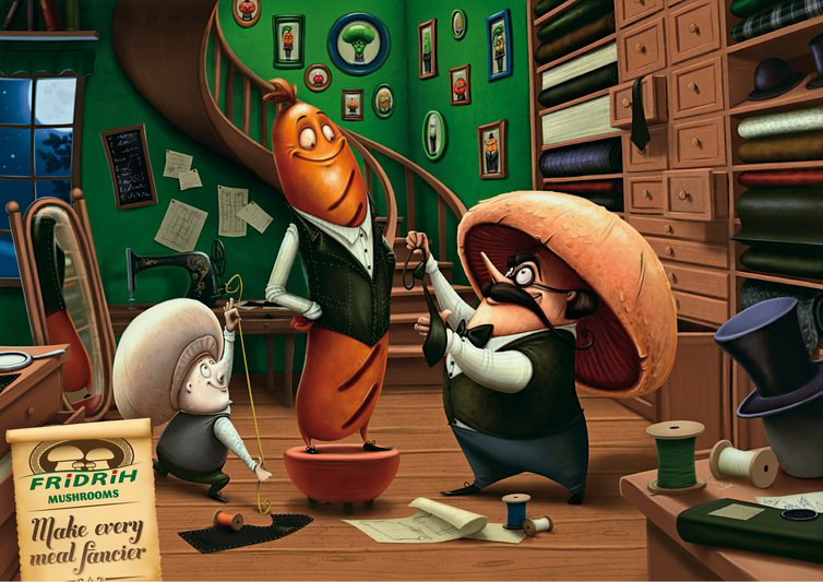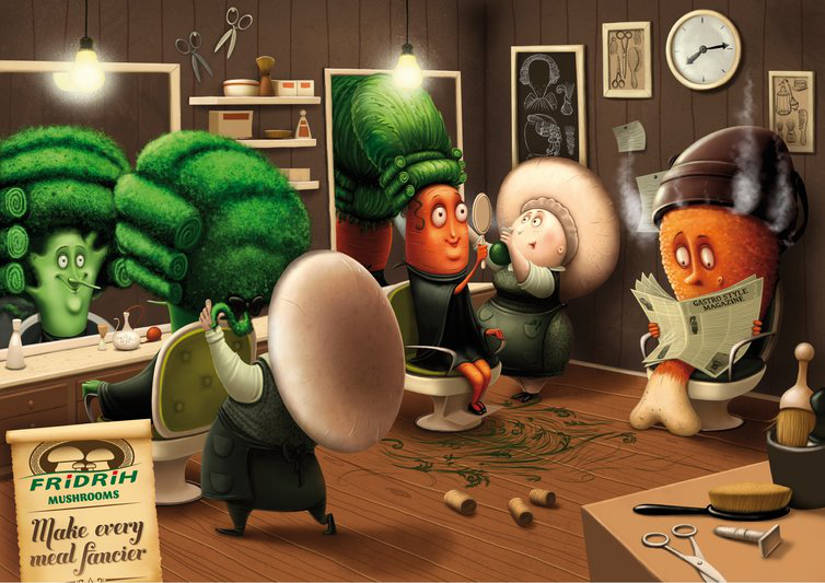 ▲Fridrih Mushrooms调味剂广告:作为一种调味剂,Fridrih Mushrooms就像是调教顽皮学生的名师、技艺精湛的美发师、妙手裁衣的裁缝,总能让食物迸发出本身最美妙的滋味。强大的执行,可爱的插画风,有料又风趣。