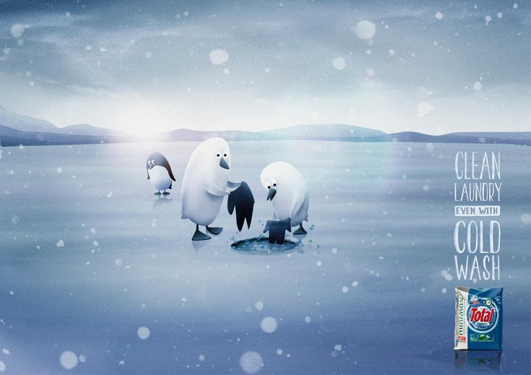 ▲Total洗衣粉广告:企鹅不容易,严寒环境下,洗衣粉化不开,连外套都没法洗。还好有Total洗衣粉。相当卖萌的一支广告。