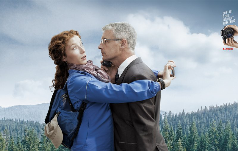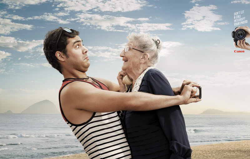 ▲佳能相机广告:智能手机功能的完善,令智能手机的普及度日益增大,同时许多用户也都养成了用手机拍照的习惯。只是,手机毕竟是手机,有可能你在捕捉一张好画面的时候,突然来了一通电话,一张摄影好相片也就此泡汤。佳能相机的这则广告就从该立意点出发,广告画面相当有趣。