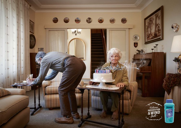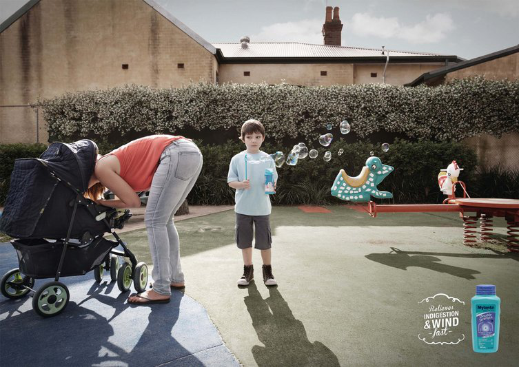 ▲Mylanta胃药广告:这则广告有点无厘头。消化不良、肠胃不好,结果不小心“泄气”给自己带来了尴尬。不想在别人面前有此等尴尬,那就赶紧找Mylanta胃药帮忙吧。
