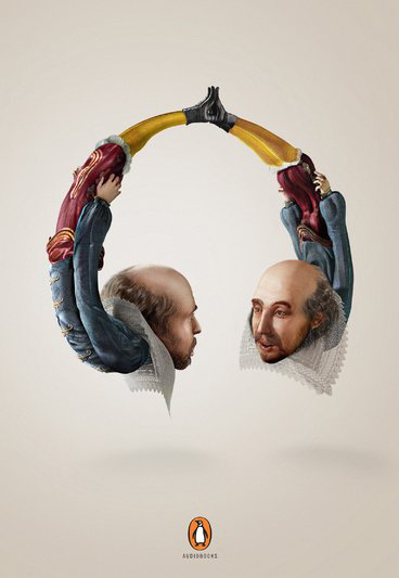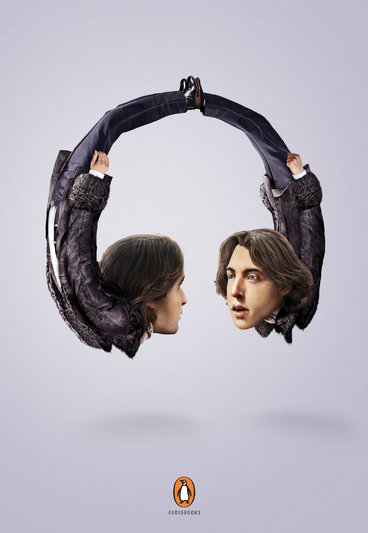 ▲企鹅有声读物广告:非常简洁一针见血的创意执行,由莎士比亚、马克·吐温、王尔德身体围成的耳麦,既明晰诉求,又突出企鹅有声读物的制作水平和声源质量的精良,犹如作者亲临耳边为你读书一般。形式上足够出新,让人一目了然又印象深刻。