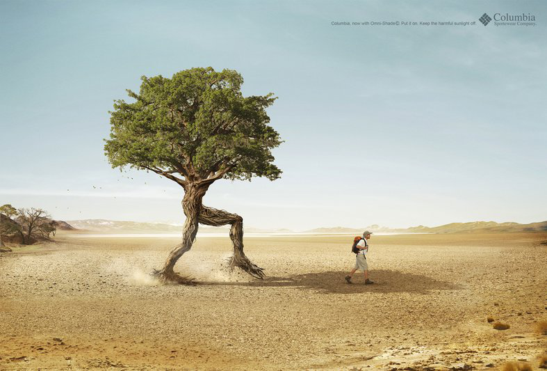 ▲哥伦比亚太阳眼镜广告:哥伦比亚太阳眼镜,隔绝强光伤害,就好似随时有大树好遮荫。很有趣味的一则广告。