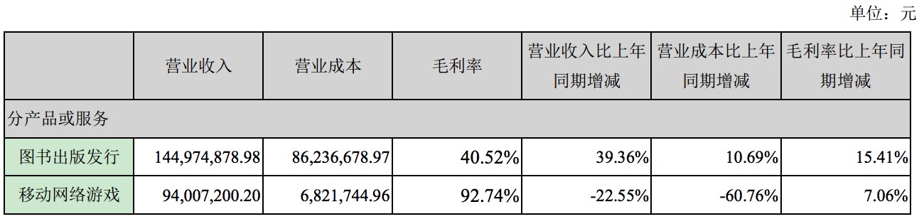 如表所示,天舟文化主营收入为图书出版发行业务,营业收入 1.45亿元,占营业收入总额的 61%,较上年同期增长 39.36%;营业成本 8623万元,较上年同期增长 10.69%;毛利率较上年同期增长 15.41%。主要原因为:1、报告期部分高毛利图书的收入较上年同期增加;2、报告期收购人民今典 51%股权,合并收入增加 1398 万元,合并成本增加 743.24万元。