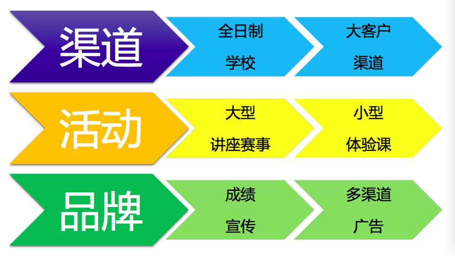 通过课程招生之后有了一定的产品来做承接,接下来我们来学习如何做市场。关于市场招生方面,是个老生常谈的事情,如下图所示,分为三种颜色,蓝色部分是通过渠道招生,黄色部分是通过活动来进行招生,以及通过品牌宣传(绿色)等等来进行招生,这三种方式比较常见。