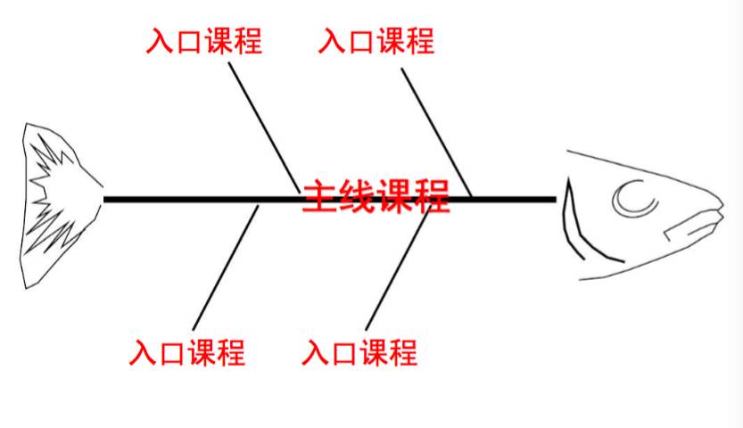 如上图,鱼的主骨是一个主线课程,上下分支骨头是入口课程,刚才提到的期中考试的冲刺班、短线课程的引入都可以拿来做入口班。这就可以让我们的主线课程越来越大。其实主线课程大了之后,当你开短线课的时候,基本上就不用担心招生了。