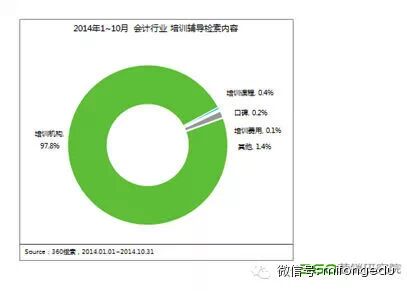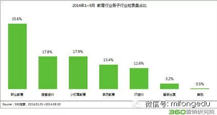 报告显示,2014年1—9月期间,教育行业的检索量从3月开始出现明显提升,峰值出现在2014年6—7月。其中职业教育占教育行业总检索量的35.6%,且增幅最大;语言培训和小初高教育以接近20%的检索量紧随其后。