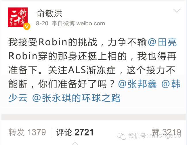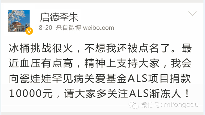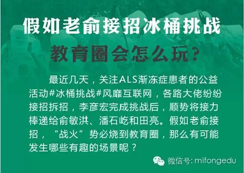 冰桶挑战全称为“ALS冰桶挑战赛”(ALS Ice Bucket Challenge),要求参与者在网络上发布自己被冰水浇遍全身的视频内容,然后该参与者便可以要求其他人来参与这一活动。活动规定,被邀请者要么在24小时内接受挑战,要么就选择为对抗“肌肉萎缩性侧索硬化症”捐出100美元。该活动旨在是让更多人知道被称为渐冻人的罕见疾病,同时也达到募款帮助治疗的目的。目前“ALS冰桶挑战赛”在全美科技大佬、职业运动员中风靡。目前已扩散至中国,大佬纷纷响应。蜜蜂网希望借此机会,呼吁教育界的同仁,勇敢“湿身”的同时,更多的关注渐冻人群体。