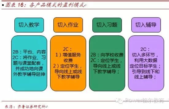 2B业务不仅可以走向2B盈利模式,亦可以是2B2C或者2C,这取决产品本身和市场环境。在这几种模式中,我们最看好能够做到2B2C模式的公司,同时我们认为能够做到2B2C就必须切入教学过程。切入教学过程和作业环节的产品都需要和老师打交道,然而当下很多单纯的作业环节的产品还很难向B端收费,至于如何在C端产生盈利我们下面会分析。