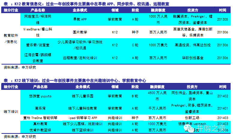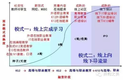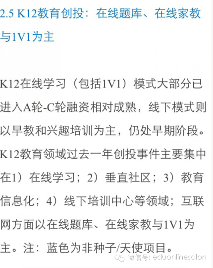 K12在线学习(包括1V1)模式大部分已进入A轮-C轮融资阶段已相对成熟,线下模式则以早教和兴趣培训为主,仍处早期阶段。