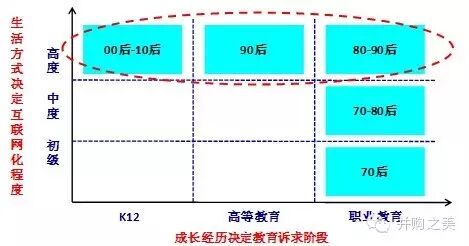 80后、90后、00后的互联网化将分别带动职业教育、高等教育、K12教育的互联网化: