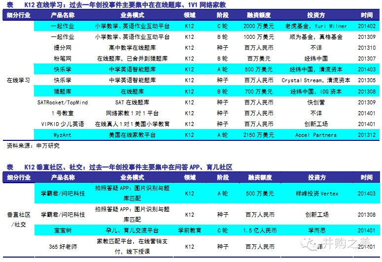 K12教育创投:在线题库、在线家教与1V1为主,高等与职业教育创投:网校、社区、MOOC居多。K12教育领域过去一年创投事件主要集中在: