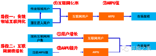 互联网市场容量预测两种方法:1)预测传统与潜在用户的互联网化程度与ARPU值进而得出市场规模;2)预测现有互联网模式的用户增长及ARPU值提升进而得出市场规模;我们这里采用第一种方法。