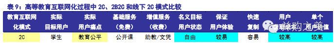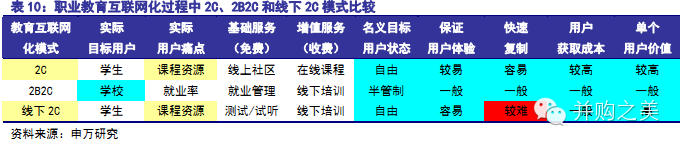 职业教育学生自主性最强,痛点是就业压力进而课程资源,线上/线下2C模式均具优势。职业教育的痛点是就业能力进而考证课程资源,诸如CPA、CFA等职业证书是大学生最趋之若鹜并积极“自主学习”的对象,这一点是K12甚至高等教育都没有的用户优质属性,因此能提供丰富线上优质学习资源的产品模式将能够胜出。