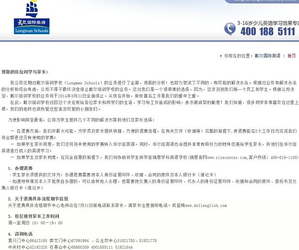 戴尔培训在官网上向学生和家长致信表示:“公司近期对戴尔培训学校的业务进行了全面、彻底的分析;也努力尝试了不同的、有可能的解决办法。根据对业务和解决办法的分析和综合考虑,公司不得不最终决定停止戴尔英语培训学校的业务......根据公司决定,戴尔培训学校的业务将于2014年8月31日全面停止。”