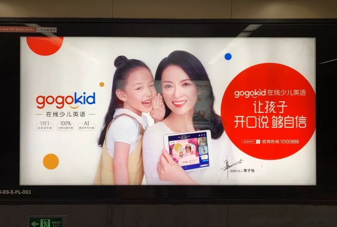 甫一成立,gogokid就展开了铺天盖地的品牌宣传,并请来了章子怡代言,势头迅猛。彼时在巴士、楼宇、地铁、综艺节目等场景,都能看到gogokid的广告。