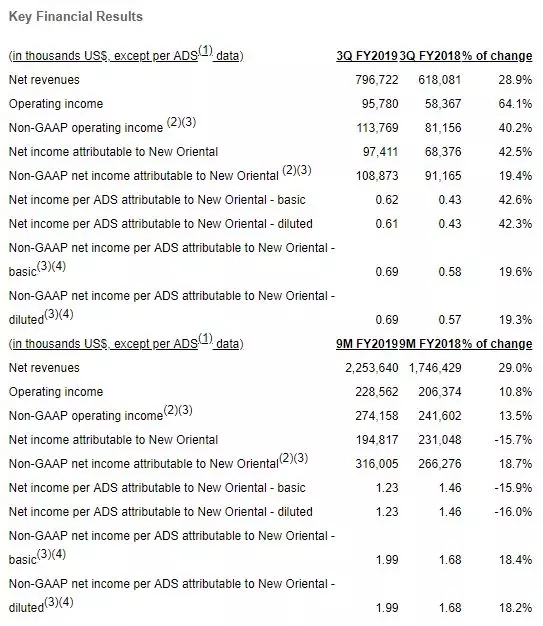 新东方周二发布了该公司截至2019年2月28日的2019财年第三财季财报。财报显示,新东方第三财季总净营收为7.967亿美元,同比增长28.9%;归属新东方的净利润为9740万美元,同比增长42.5%。