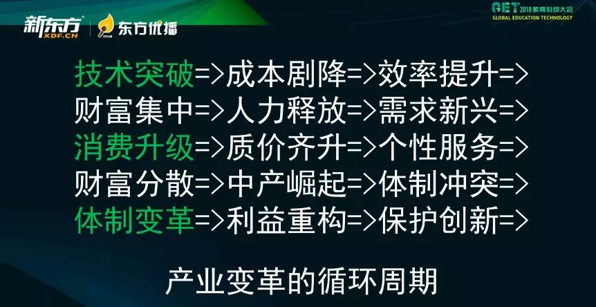 整个循环技术就是技术突破导致成本剧降,成本剧降导致效率提升。效率提升一定会带来财富集中,而财富集中会导致人力释放,这时候会产生新的需求。如果一个国家效率提升了,但是没有创造新的需求,这个国家一定会陷入动荡。