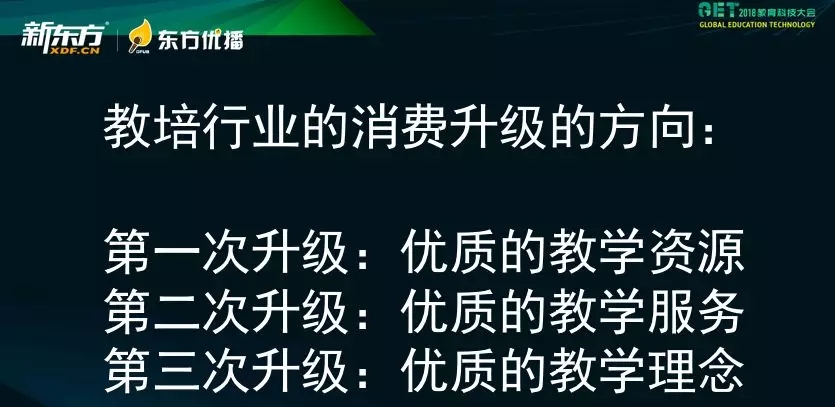 第二次消费升级是2008—2010年左右的时候,是以优质的教学服务为导向,大家开始关注服务了。因为我在做东方优播,它其实就是通过互联网小班模式进入三四五线城市,我进到很多的三四五线城市跟20年前的北京太像了,老师就是讲课,讲课之后拍屁股走人,什么都不用管,班级规模比较大。
